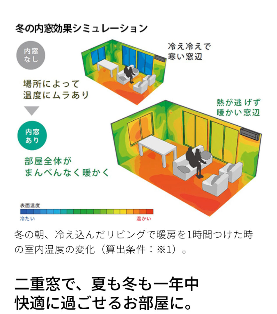 窓は、熱の出入りが一番多い場所。だから窓の断熱が大切なのです。内窓を取付けることで夏でも冬でも快適な室内空間を実現します。