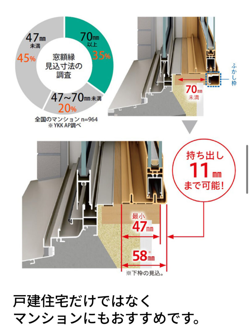 マンションでも設置位置は専有部なので戸別のリフォームが可能です。窓の額縁が薄い場合でも薄見込仕様の「ウチリモ」なら既存の窓枠に簡単に取付けられます。これまでマンションの窓の多くは窓額縁の見込寸法が内窓取付けに必要な70㎜に足りず「ふかし枠」が必要でしたが、「ウチリモ」は枠見込み58㎜の薄型設計を採用。さらに枠持ち出し納まりにより、額縁取付寸法が最小47㎜あれば、ふかし枠なしで内窓の設置が可能です。